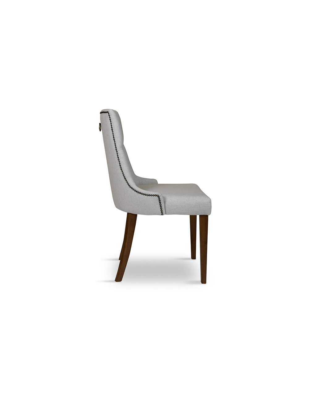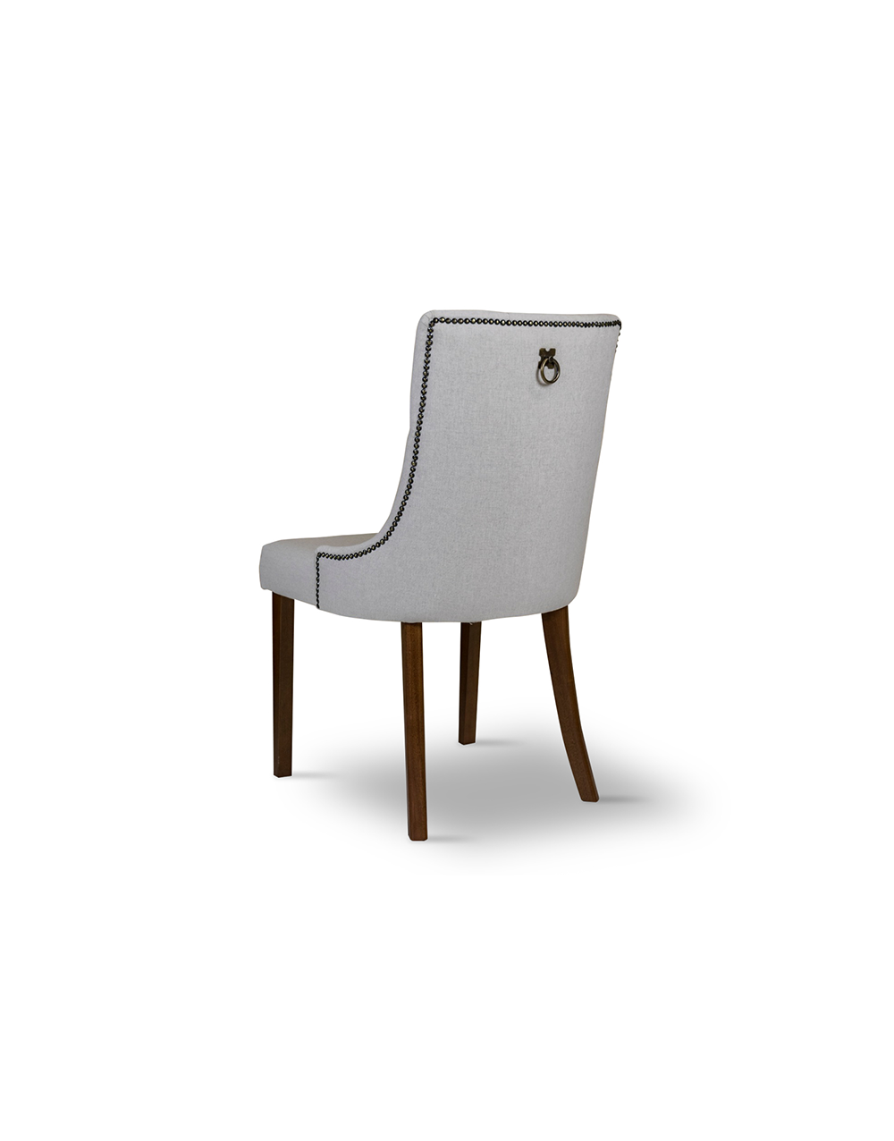 Cadeira com pés de madeira, tachas e puxador.